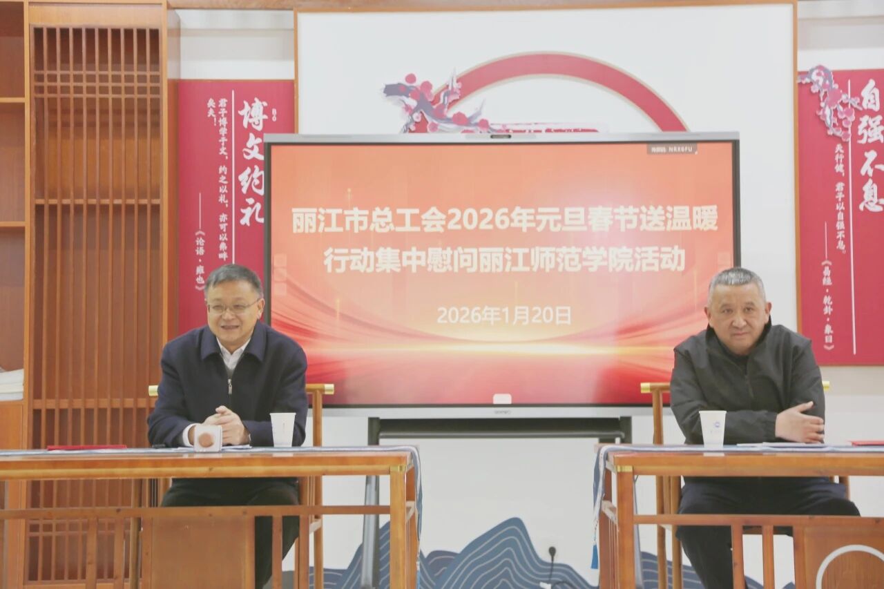 岁末天寒,情暖校园。为落实云南省总工会、丽江市总工会2026年元旦春节送温暖行动部署,切实把党和政府的关怀与工会组织的温暖送到一线职工和困难教职工心坎上,1月20日,丽江市总工会到学校开展“2026年元旦春节送温暖”慰问活动。丽江市总工会党组书记、常务副主席李文渊、丽江市总工会维权服务部部长张豪、市总工会何逵及学校党委书记毕天云、校长陈本辉、党委副书记章之尧、纪委书记彭吉萍、副校长张兰胜出席活动,学校工会、保卫处相关负责人及受慰问职工参加活动。