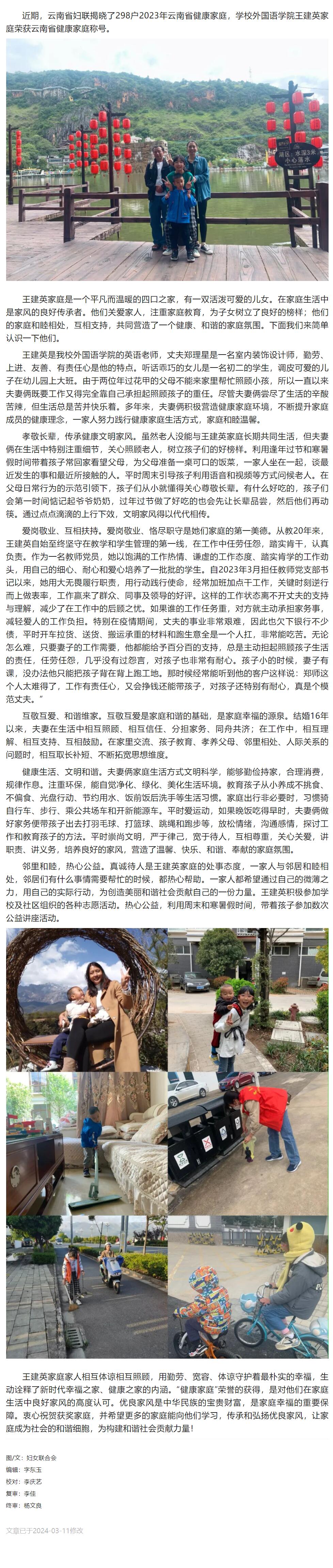 喜讯丨学校王建英家庭入选云南省健康家庭名单