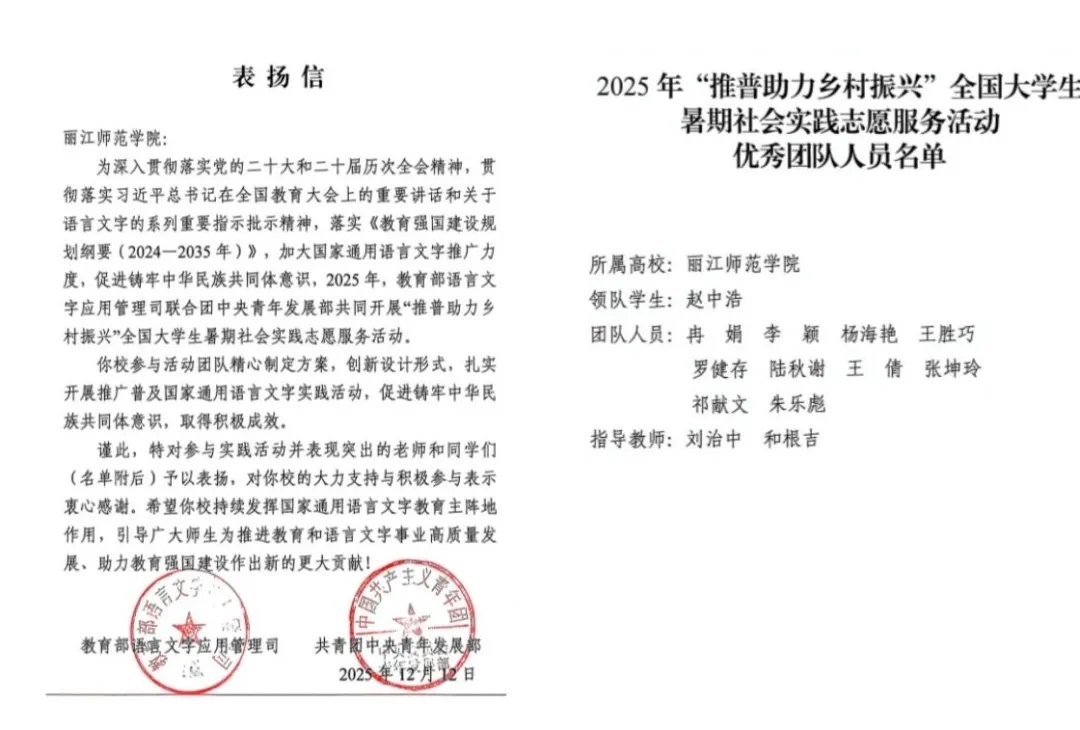 近日,教育部语言文字应用管理司与共青团中央青年发展部联合发来表扬信,对我校在2025年“推普助力乡村振兴” 全国大学生暑期社会实践志愿服务活动中的积极参与和突出成效予以表扬。