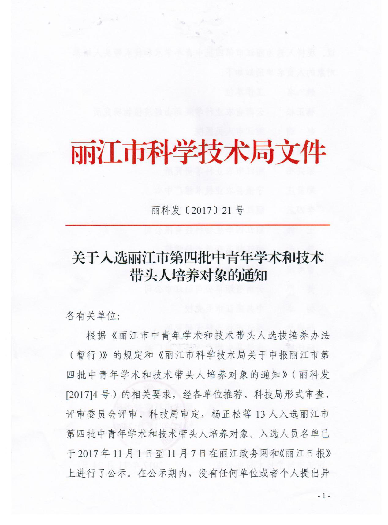 近日,收到丽江市科技局《关于入选丽江市第四批中青年学术和技术带头人培养对象的通知》丽科发[2017]21号文件,我校国际旅游与工商管理学院普荣老师入选丽江市第四批中青年学术和技术带头人培养对象,丽江全市共13人入选。